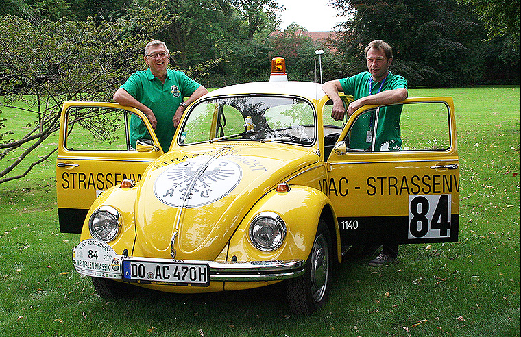 Die 34 PS zerren an der Halsmuskulatur, als ich in der Autobahnauffahrt beschleunige. Und plötzlich wird die Welt freundlich – irgendwie scheinen sich alle zu freuen, dass sie uns sehen. Käfer sieht man immer wieder mal, aber einen kanariengelben ADAC Käfer eben nicht. Freundliches Winken, Fotografieren, Hupen und lachende Gesichter sind ab jetzt normales Programm. Man ist auf einmal auf Zeitreise, Erinnerungen an völlig vergessene Erlebnisse, Menschen und Situationen kommen wieder zum Vorschein, und lassen mich versonnen grinsen. Aber einen Käfer zu fahren ist im Vergleich zu unseren heutigen Autos echte Arbeit. Das fingerdicke, aber riesengroße Lenkrad ist wahrlich nötig, um das Auto bei geringen Geschwindigkeiten um die Kurven zu zirkeln. Kupplung und Bremse erfordern deutlich mehr Kraftaufwand. Und man gewöhnt sich wieder den Schulterblick an.