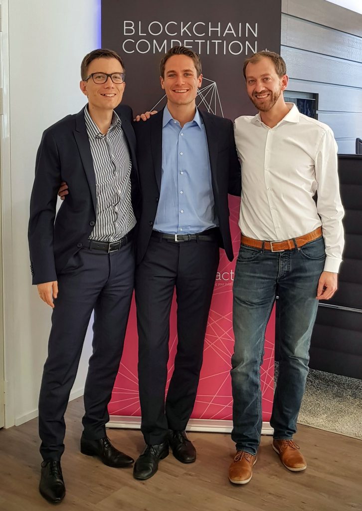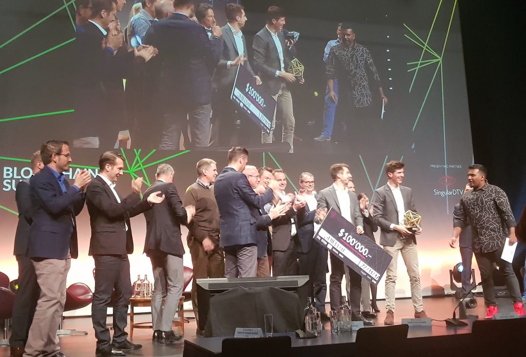 Mit nur 15 externen Entwickler-Tagen haben wir einen Prototyp entwickelt, den wir bei dem Wettbewerb eingereicht haben. Daran haben sich 107 Teams aus 31 Ländern beteiligt. Wir waren bereits hocherfreut, dass wir die Papierauswahl und den Tech Review überstanden haben und zur 2. Auswahlrunde Mitte Oktober nach Zug eingeladen wurden. Dort durften wir 15 Minuten vor einer 17-köpfigen Jury pitchen und deren Fragen beantworten. Anfang November haben wir dann erfahren, dass wir es geschafft haben und zu den 10 Finalisten gehören, die Ende November im Rahmen einer internationalen Blockchain Konferenz, dem Blockchain Summit, ihre Lösung pitchen dürfen. Damit war unser selbst gestecktes Ziel bereits erreicht. Die Herausforderung bestand nun darin, einen interessanten Vortrag mit nur drei Minuten Länge vorzubereiten. Die Vorbereitung war intensiv, doch wir haben es geschafft. Hier ist die Aufzeichnung der kompletten 4stündigen Veranstaltung zu finden, unser Pitch startet bei 1:51:40. Sehenswert sind auch der Trailer am Anfang und die Key-Note von Stephan Karpischek, Mitgründers von Etherisc, eines weltweit führenden Blockchain InsurTechs (2:16:00).