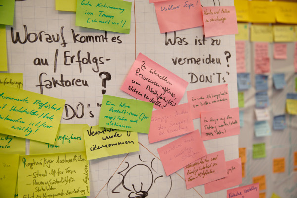 Beim Design Thinking ist ein kreatives Umfeld das A und O. Was damit gemeint ist, habe ich bei meinem Walk dann auch gesehen, denn das Lab hier bei uns in der „Pop-Allee“ in Bonn ist vor allem eins: Voll mit bunten Klebezetteln. Auf den ersten Blick ein Chaos aus Neongrün und Neonpink, bei näherer Betrachtung erkennt man dann aber doch ein klar strukturiertes Schema. Neben bunten Klebezetteln gibt es auch eine Reihe von bunten Sitzsäcken, auf die man sich zum Brainstormen alleine oder in Grüppchen niederlassen kann. Echt komfortabel. Und auch insgesamt herrscht in den Labs eine sehr ausgelassene Stimmung. Ein tolles Miteinander, das uns Besucher an diesem Tag echt mitnimmt.