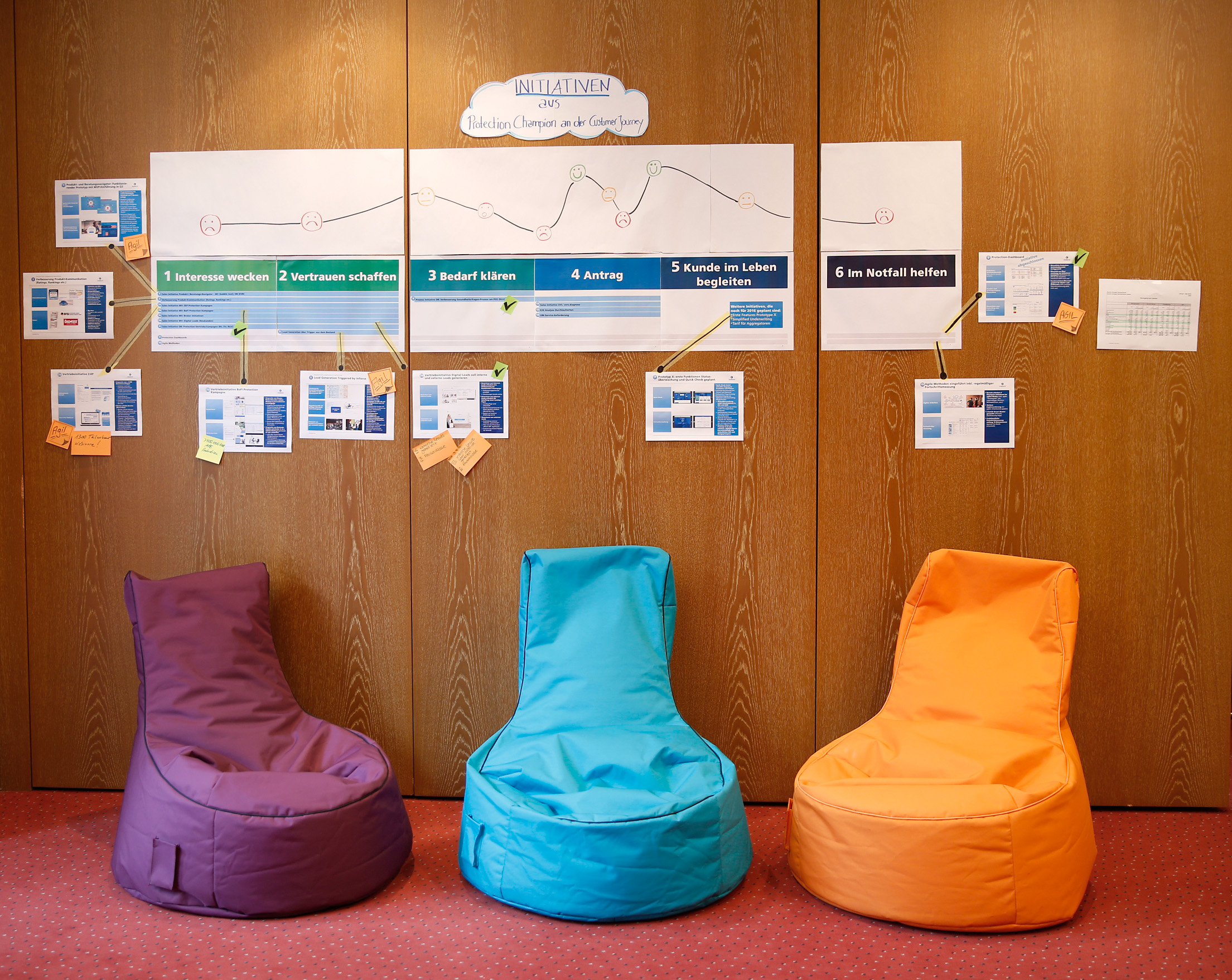 Bei Zurich nimmt der ganze Design Thinking-Ansatz Gestalt in Form von so genannten „Champion Teams“. Nein, das hat nichts mit dem Queen-Klassiker von 1977 zu tun. Bei den Champion Teams handelt es sich um sechs Teams, die in den Labs an unterschiedlichen Themenschwerpunkten arbeiten. Dabei arbeiten sie an unterschiedlichen kundenorientierten Initiativen im Bereich Vorsorge zum Beispiel im Falle einer Berufsunfähigkeit, beschäftigen sich mit Rentenversicherungsthemen oder schauen sich die Generation Y an. Zudem gibt es noch Teams, die sich mit besonderen Themen aus dem Motor-Bereich beschäftigen. Auch Kleine-und mittelständische Unternehmen sind im Fokus sowie natürlich ganz klassische Sachversicherungsthemen. In Teams von zehn bis 15 Mitarbeitern werden für diese Schwerpunkte dann neue Ideen entwickelt.