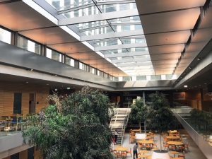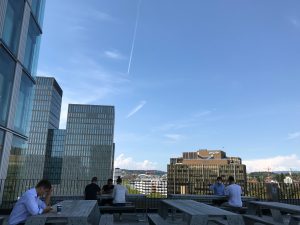 In der Mittagspause ging ich mit meinen Kollegen aus der Abteilung oft in einer super Kantine essen, wo das Essen an Live-Kochstationen zubereitet wurde. klar – leider hat dieses gute Kantinenessen auch seinen Preis. Die Gerichte liegen alle zwischen 10-16 CHF, was fast dem gleichen Preis in Euro entspricht. Und auch sonst muss man sich an die Preise hier in der Stadt erstmal gewöhnen. Ein Döner mit 10 CHF oder ein belegtes Brötchen mit 8 CHF entspricht fast dem dreifachen Preis bei uns in Deutschland. Das Highlight am Standort Zürich war aber das Cafe mit der Dachterrasse im 8. Stock des Gebäudes.