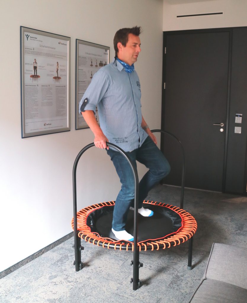 Jetzt geht es darum, die gezeigten Möglichkeiten in den Arbeitsalltag einzubauen und hier muss, glaube ich, jeder seinen eigenen Weg finden. Ich persönlich starte jeden Tag auf der Kybun-Matte, checke dabei die eingegangenen Mails und plane mit Blick auf den Kalender meine Mikropausen, auf die ich dank unserer Betriebsvereinbarung „Gesundheit“ Anspruch habe. Ich schaue nach einer Telko, die ich auf dem Deskbike verbringen kann, nutze den Hocker jetzt richtig, verbringe zwei bis drei Mal pro Tag fünf Minuten auf dem Bellicon und laufe den ganzen Tag in unserem Bereich ohne Schuhe herum. Auf dem Bellicon habe ich inzwischen in der letzten Minute immer die Augen zu, während ich schwinge. Dann bin ich so sehr damit beschäftigt, mich auf dem Bellicon zu halten, dass ich alles andere in dem Moment vergesse.