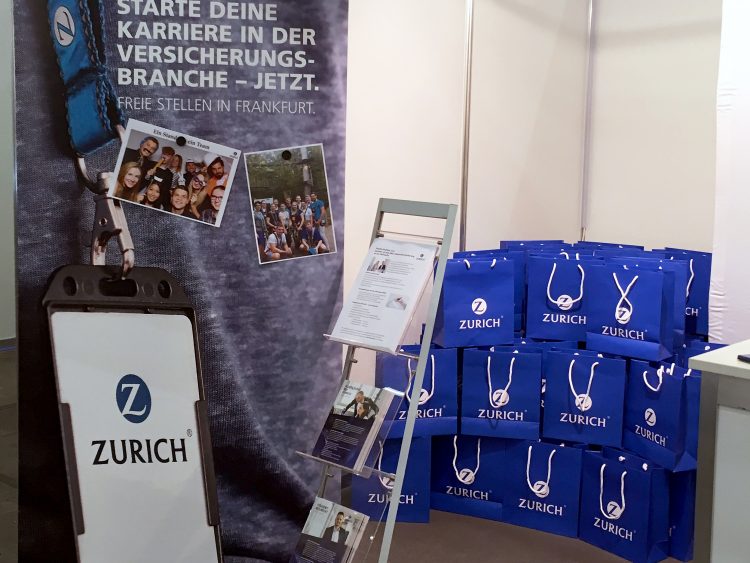 Nicht zu vergessen ist natürlich, dass wir durch unseren neuen Standort im Pollux direkt an der Messe Frankfurt, die besten Voraussetzungen haben auch an solchen teilzunehmen. Ende Mai fand hier die Messe „Einstieg Abi“ in der Frankfurter Messe statt. Viele Besucher, Schüler und Interessierte kamen, auf der Suche nach Ausbildungs- und Job-Möglichkeiten. Das haben wir natürlich direkt nutzen wollen. Morgens um 7:30 Uhr haben wir begonnen, uns auf die Massen an zukünftigen Absolventen der Schulen in Hessen vorzubereiten und unseren Messestand aufzubauen. Damit unsere Gesprächspartner nicht leer ausgehen und uns in guter Erinnerung behalten würden, packten wir unglaublich viele Zurich Tüten mit kleinen Geschenken. Um Punkt 9:00 Uhr kam dann der Startschuss: Die Türen zur „Einstieg Abi“ wurden geöffnet und es ging los. Zu Beginn doch noch etwas müde fingen wir an, uns mit den ankommenden Schülern zu unterhalten. Das Interesse war extrem hoch und ohne ab und zu einen kleinen Schluck Wasser zu trinken hätten unsere Stimmen sicherlich schon vor der Mittagspause versagt. Die meisten Schüler konnten sich zunächst nicht wirklich etwas unter Versicherung, und besonders nichts unter einer Industrieversicherung vorstellen, sodass wir den neugierigen Schülern in der Regel unsere gesamten Aufgabenfelder und Jobs erklären konnten. Überraschend war ebenso die Internationalität der Messebesucher. Dabei kamen unsere Interessenten aus aller Welt und hatten teilweise auch wirklich interessante Geschichten dabei, die wir uns anhören durften. So herrschte keine einzige Sekunde des Tages Langeweile.
