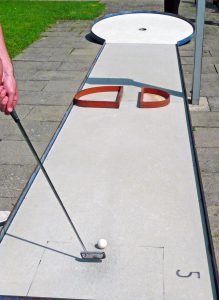 Der Schweizer Paul Bongni entwickelte 1951 die standardisierte Form des Bahnengolfs mit 18 zwölf Meter langen Betonbahnen und verschiedenen Hindernissen. Seine Minigolf-Version wird in internationalen Wettbewerben gespielt und ist in Europa am weitesten verbreitet. Der beste Schnitt pro Runde beträgt also 18 Punkte, wobei auch Profis nicht jeden Ball gleich beim ersten Schlag versenken. Als zweites Standardsystem etablierte sich Miniaturgolf mit 18 Golfbahnen aus Eternitplatten von 6,25 Metern Länge. Die Schläge beim Bahnengolf entsprechen der Technik eines Golfers, der auf dem Grün puttet. Dabei sollte der Schläger wie ein Pendel vor dem Körper geschwungen werden. Ambitionierten Hobbyspielern empfehle ich einen Turnierschläger, dessen Fuß mit einem Schlaggummi versehen ist: Dadurch lässt sich der Ball mit erheblich mehr Gefühl spielen. Für den Einstieg in den Minigolfsport ist es übrigens nie zu spät. Mein Schwiegervater ist mit über 80 Jahren noch aktiv. Angefangen hat er mit 70.