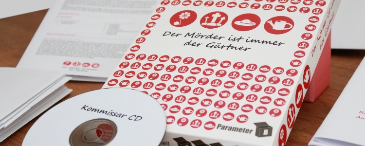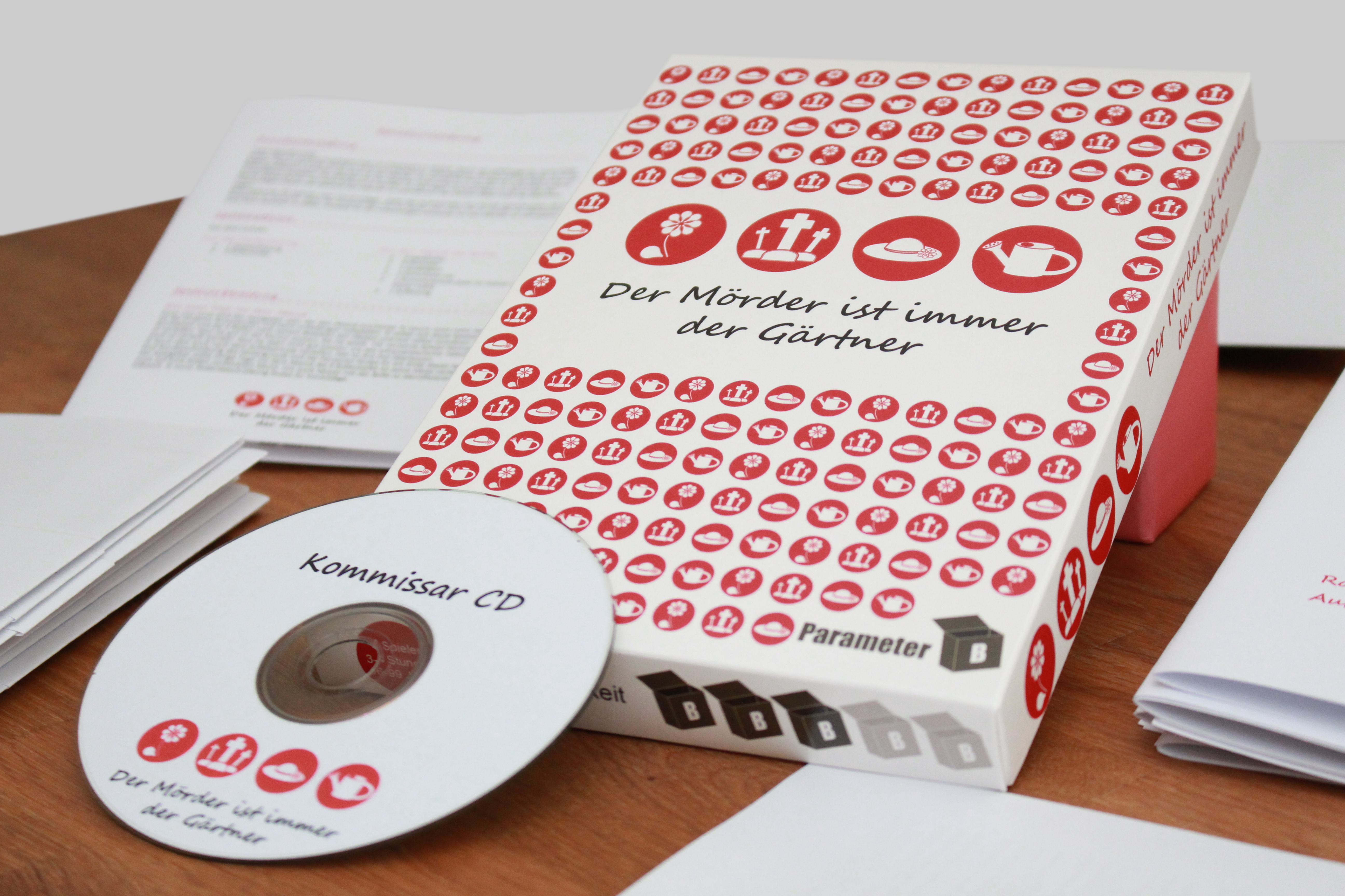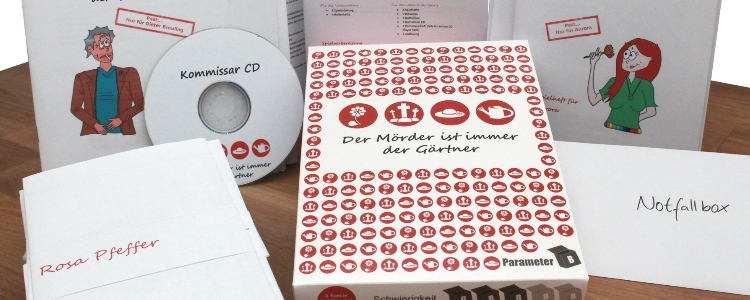In nur drei Monaten habe ich mein erstes Krimispiel „Der Mörder ist immer der Gärtner“ fertiggestellt. Vom Karton über die Rollenbeschreibungen und Spielhefte, die Kommissar CD, und die Spielanleitung, bis hin zu dem umfangreichen Hinweismaterial ist alles selbst designed, selbstgeschrieben und selbstgesprochen. Ich habe Comics für meine Charaktere selbstgezeichnet und Piktogramme für das Layout erstellt. Auch ein Logo für mein neu gegründetes Unternehmen „Parameter B“ habe ich angefertigt. Für den Notfall habe ich meinem Spiel eine „Notfallbox“ dazugelegt. Sollten die Spieler wirklich nicht weiter kommen oder das Gefühl haben, dass das Krimispiel nicht richtig läuft, dann können sie die Notfallbox zur Hilfe nehmen. Sie liefert ein paar Tipps, die helfen, den Mörder zu finden und den Mord aufzuklären.