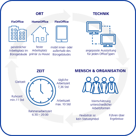Worum geht es bei FlexWork eigentlich? Vereinfacht gesagt, haben wir zwei Modelle entwickelt, in denen Mitarbeiter flexibel arbeiten können. Die beiden Modelle heißen HomeOffice (der Arbeitsplatz ist zu Hause und im Bürogebäude) und FlexOffice (der Arbeitsplatz wird von der aktuellen Anforderung an den Job bestimmt). Entscheidend ist, dass die Tätigkeit und der Mitarbeiter persönlich für eines der beiden Modelle geeignet ist. Ich selbst kann zum Beispiel nicht im HomeOffice arbeiten. Ich führe in meinem normalen Arbeitsalltag schwerpunktmäßig Workshops und Coachings durch. Das geht natürlich nicht von zu Hause aus. Meine Funktion erfordert dennoch Flexibilität, und deshalb ist es für mich möglich, dass ich im FlexOffice arbeite.