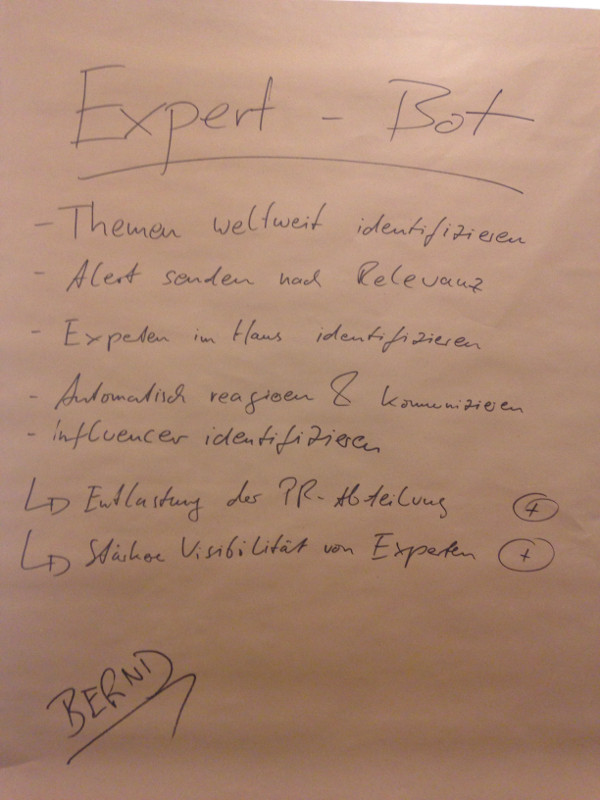 Als wir dann pünktlich zum Kick-off des Hackathons in der Jahrhunderthalle in Hoechst eintreffen, ist eine kreative Aufbruchstimmung durchaus zu spüren, was an der kargen und alles andere als inspirierenden Location jedenfalls nicht liegt. Nein, es ist der Mix aus zahlreichen Kommunikationsprofis, Entwicklern und Designern. Eine Melange, die in dieser Zusammensetzung eher selten aufeinander trifft und auch kreative Spannung verspricht. Rund 100 Leute machen mit. Wow. Dann geht’s auch schon los, das Pitchen (Neudeutsch für: Präsentation halten um einen Auftrag zu bekommen) um Mitstreiter beginnt. Auch mein Chef, „der Bernd aus dem Rheinland“, wie er sich vorstellt, pitcht mit und präsentiert unsere Idee, die vorab auch schon im Fachmagazin PR Report vorgestellt wurde: Wir planen eine Softwarelösung, die Social Media-Trends frühzeitig erkennt und diese automatisch mit definierten Unternehmensexperten und ihren Statements verknüpft. So soll es möglich werden, Themen schnellstmöglichst zu identifizieren, mit passenden Zitaten und Zitatgebern zu besetzen und damit kontinuierlich in den sozialen Medien präsent zu sein. Ein Bot für’s ‚Grundrauschen‘ sozusagen.