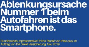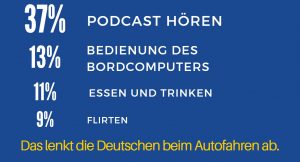 Laut aktueller DA Direkt Statistik haben drei Ablenkungs-Faktoren einen signifikant hohen Einfluss darauf, in einen Unfall oder in eine gefährliche Situation zu geraten: Dazu zählen die Nutzungshäufigkeit des Smartphones, eine gereizte Stimmung im Auto und die eigene Angst des Fahrers davor, dass andere Verkehrsteilnehmer eine Gefahr darstellen. In Summe können so rund zwei Drittel (60%), der durch Ablenkung verursachten Unfälle erklärt werden.Es sind die scheinbar harmlosen Dinge, die Autofahrer während der Fahrt machen, diese sorgen aber oft für Unaufmerksamkeit und Ablenkung – das belegen die Studienergebnisse. So kommt die Studie zu dem Ergebnis, dass mehr als ein Drittel (37%) der deutschen Autofahrer durch Podcasts und Hörbücher ablenkt ist. Auch das Flirten während der Fahrt lenkt jeden Zehnten ab (9%). Genauso häufig ist Essen oder Trinken während der Fahrt für die Ablenkung verantwortlich (11%).