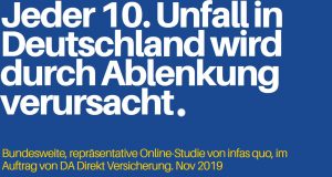 Im Straßenverkehr gibt es viele Gefahrenquellen. Alkohol, Drogen, Müdigkeit und zu schnelles Fahren – Unfallursachen, die in der öffentlichen Wahrnehmung meist überwiegen. Eine zentrale Gefahr wird dabei sehr häufig unterschätzt: die Ablenkung. Das bestätigen die Daten der DA Direkt Erhebung: Auf Deutschlands Straßen verursacht Ablenkung jeden zehnten Unfall oder führt zu einer gefährlichen Situation. Damit stellt die Ablenkung statistisch gesehen eine ebenso große Gefahr dar wie zu schnelles Fahren. Sollte es bei aller Vorsicht doch zu einer Unfallsituation kommen, ist es wichtig zu wissen wie man im Schadenfall reagieren sollte.