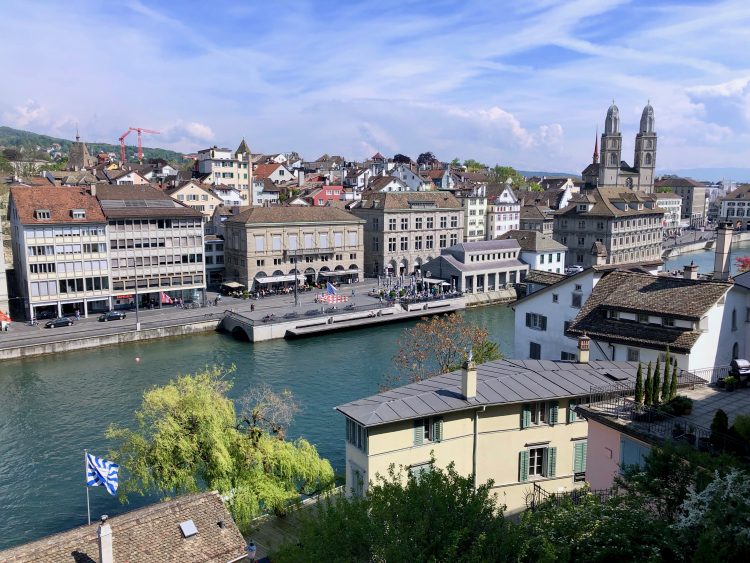Dort begann unsere Stadtführung. Während der Tour bekamen wir diverse Hintergrundinformationen über die verschiedenen Baustile der Stadt und deren Geschichte. Über die Bahnhofsstraße führte die Fußroute zur Limmat. Hier erfuhren wir, dass das kleine Stück Wiese, wo wir zu Mittag aßen, das teuerste Stück Rasen der Welt ist. Hoffentlich haben wir keinen Stängel abgebrochen ???? Von dort aus besuchten wir den Lindenhof, ein Platz, der einen tollen Ausblick auf eins der Wahrzeichen Zürichs bietet – das Grossmünster.