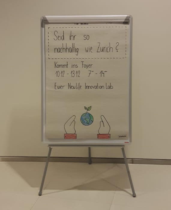 Aber von Anfang an: Ich bin aus einer anderen Abteilung in das New Life Lab gewechselt. Am 18. November 2019 hatte ich meinen ersten Arbeitstag im neuen Team und einen mittelschweren Kulturschock: Freie Arbeit an Projektzielen statt geregelter Prozesse, „kreatives Chaos“ statt nüchtern aufgeräumter Arbeitsplätze, und mehr Post-Its als ich in meinem Leben bisher gesehen hatte. Kurz, sämtliche Klischees, die man zu Versicherungen haben kann, waren erstaunlich weit weg. Den ersten Tag verbrachte ich hauptsächlich damit, das Team und die laufende Initiative zum Thema „Nachhaltigkeit“ kennen zu lernen. Mein Interesse an dem Thema war groß, und das nicht nur durch die öffentliche Aufmerksamkeit, die ihm momentan zuteil wird. Trotzdem erforderte es einiges an Geduld und Konzentration, mich in das einzufinden, womit sich das restliche Team schon seit anderthalb Monaten beschäftigt hatte. Umfragen, die durchgeführt und ausgewertet worden waren, Ideenfindungsprozesse, die kurz vor dem Abschluss standen, vollständig fremde Arbeitsmethoden, das alles war in den ersten Tagen überwältigend viel.