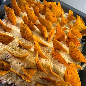 Gehacktes mit Zwiebeln braten und gut auskühlen lassen. Dann Salsa-Soße drüber geben und den Salat schichten. Zuerst den Eisbergsalat (zerstückelt), dann das Salsa-Gehacktes-Gemisch und die gewürfelten Tomaten in die Auflaufform geben. Anschließend die Creme Fraîche mischen, mit Kräutersalz würzen und auf die Tomatenschicht geben. Zuletzt noch den Käse verteilen und die Taccos vor dem Servieren in den Salat stecken.