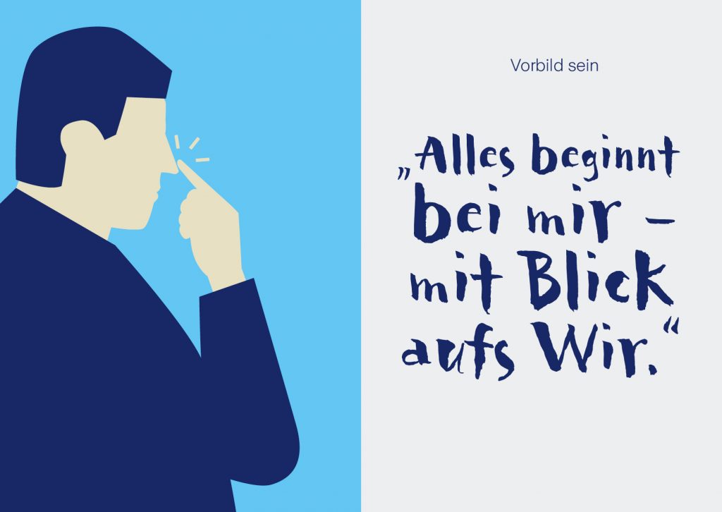Im nächsten Schritt entstand – ebenfalls aus der Mitte heraus – „Fü(h)reinander – Mein Beitrag“. Mitarbeitende haben einen direkten Anteil an erfolgreicher Führung. Deshalb haben wir in „Mein Beitrag“ konkretisiert, wie wir alle zur Umsetzung des Leitbildes und zu einem konstruktiven Miteinander beitragen können. Führung ist keine Einbahnstraße. Bei „Fü(h)reinander“ sind alle gefordert; es funktioniert nur miteinander.